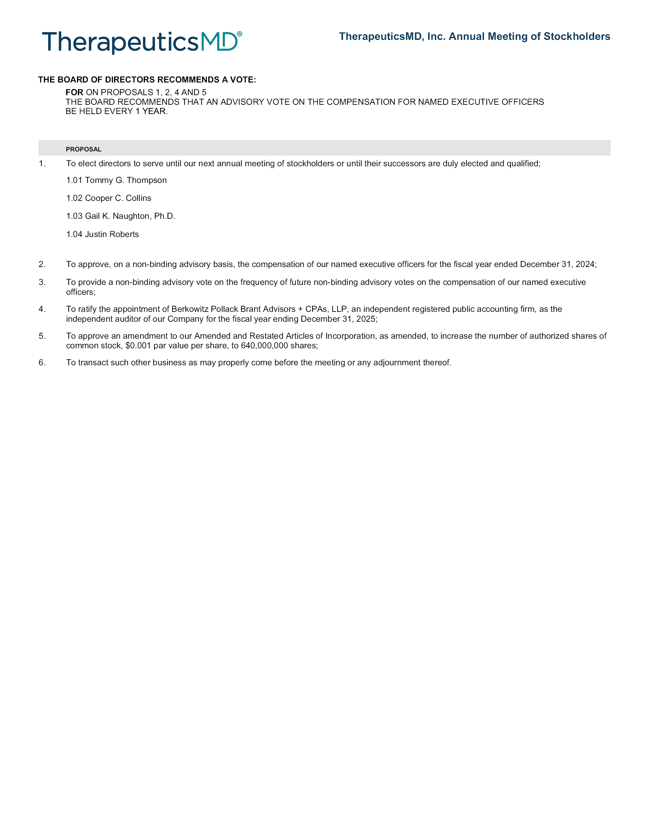 TherapeuticsMD, Inc. Annual Meeting of Stockholders THE BOARD OF DIRECTORS RECOMMENDS A VOTE: FOR ON PROPOSALS 1, 2, 4 AND 5 THE BOARD RECOMMENDS THAT AN ADVISORY VOTE ON THE COMPENSATION FOR NAMED EXECUTIVE OFFICERS BE HELD EVERY 1 YEAR. PROPOSAL 1. To elect directors to serve until our next annual meeting of stockholders or until their successors are duly elected and qualified; 1.01 Tommy G. Thompson 1.02 Cooper C. Collins 1.03 Gail K. Naughton, Ph.D. 1.04 Justin Roberts 2. To approve, on a non-binding advisory basis, the compensation of our named executive officers for the fiscal year ended December 31, 2024; 3. To provide a non-binding advisory vote on the frequency of future non-binding advisory votes on the compensation of our named executive officers; 4. To ratify the appointment of Berkowitz Pollack Brant Advisors + CPAs, LLP, an independent registered public accounting firm, as the independent auditor of our Company for the fiscal year ending December 31, 2025; 5. To approve an amendment to our Amended and Restated Articles of Incorporation, as amended, to increase the number of authorized shares of common stock, $0.001 par value per share, to 640,000,000 shares; 6. To transact such other business as may properly come before the meeting or any adjournment thereof.